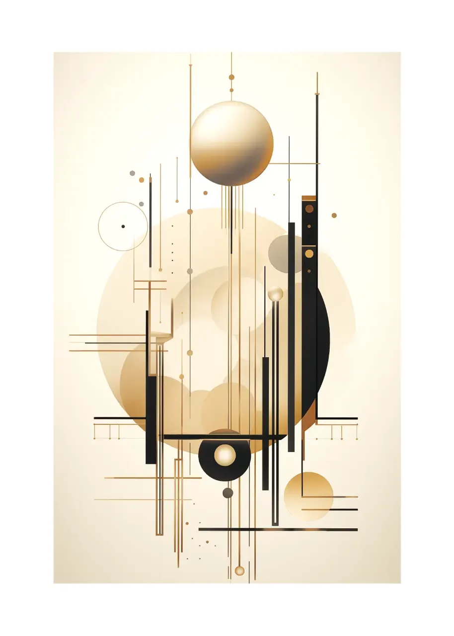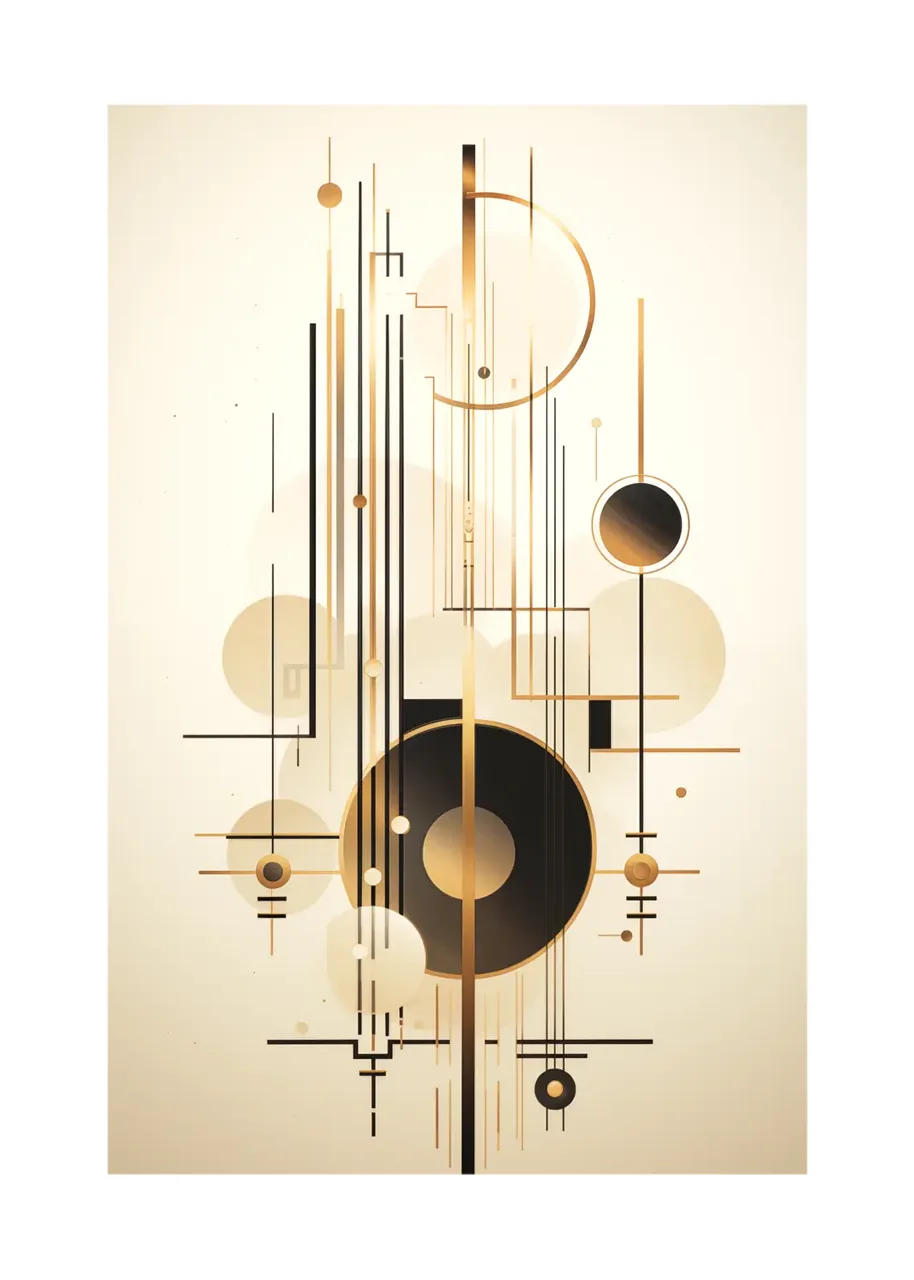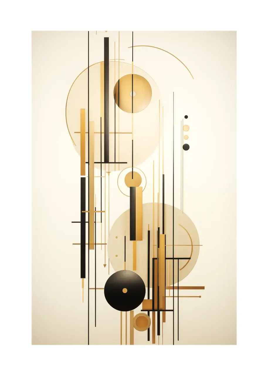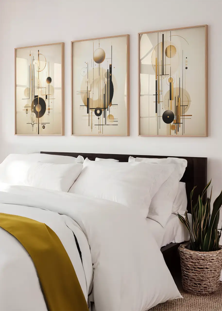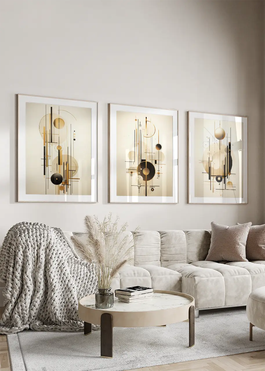 Zestaw trzech oryginalnych grafik na ścianę przedstawiających abstrakcyjne połączenie złotych i czarnych linii oraz kształtów na jasnym tle. Ta ciekawa geometryczna kompozycja może przypominać skomplikowany mechanizm i dynamikę zachodzących w niej procesów. Każdy plakat z tego zestawu został zaprojektowany z myślą o stworzeniu spójnej i jednocześnie dynamicznej narracji wizualnej. To odważny i wyrazisty zestaw plakatów, będący stylowym, przyciągającym spojrzenia dodatkiem do nowoczesnych wnętrz.